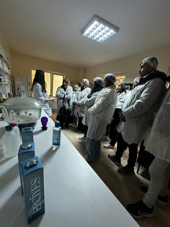 Programın devamında öğrenciler, üretim alanlarını teknik açıdan inceleme fırsatı buldu. Hammadde kabul süreçleri ile karıştırma ve dolum hatlarını yerinde gözlemleyen öğrenciler, bitkisel ve aromatik hammaddelerin endüstriyel ölçekte nasıl değerlendirildiğine dair önemli bilgiler edindi. Ardından Ar-Ge ve laboratuvar birimlerini ziyaret eden katılımcılara; formülasyon geliştirme süreci, koku ve performans denemeleri, stabilite testleri ve laboratuvarda kullanılan temel ekipmanlar hakkında detaylı bilgiler aktarıldı.