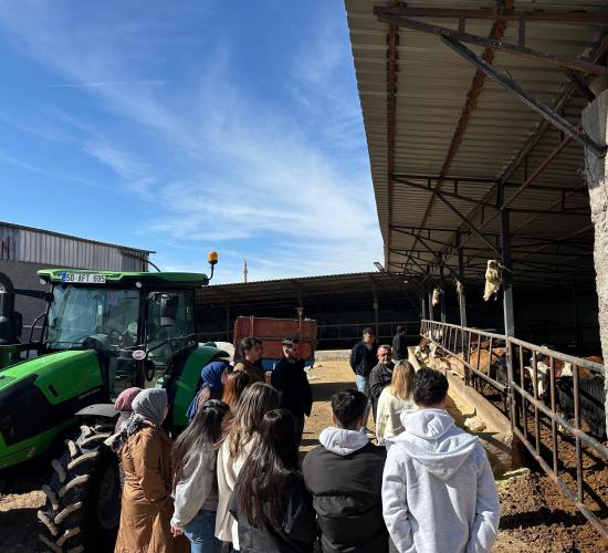 Gerçekleştirilen teknik gezi kapsamında öğrenciler, Avanos Mahmat Köyü’nde faaliyet gösteren İlker Taş İşletmesi’ni ziyaret ederek hayvansal üretim süreçlerini yerinde inceleme fırsatı buldu. Ziyaret sırasında sığır ırkları ve bu ırkların temel özellikleri, kızgınlık dönemi ve döl verimi, rasyon hazırlama, kaba ve kesif yem kullanımı, süt sağım teknikleri ile mastitis ve laminitis gibi hayvan sağlığına ilişkin konular hakkında uygulamalı bilgiler paylaşıldı.