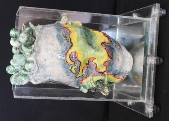 Söz konusu çalışma, organik form arayışları ve yüzeydeki çok katmanlı renk-doku ilişkisi üzerinden insan-doğa etkileşimini ele almaktadır. Formdaki deformasyonlar ve yüzeyde gözlenen akışkanlık, çevresel değişim ve tahribat olgusuna göndermede bulunan bir anlatım dili sunmaktadır.